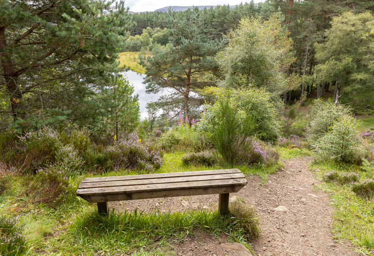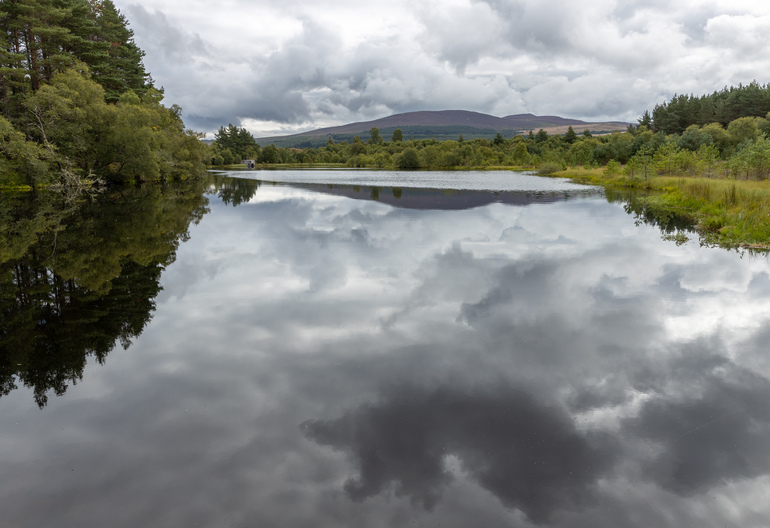 Towering redwoods surround this tranquil lochan